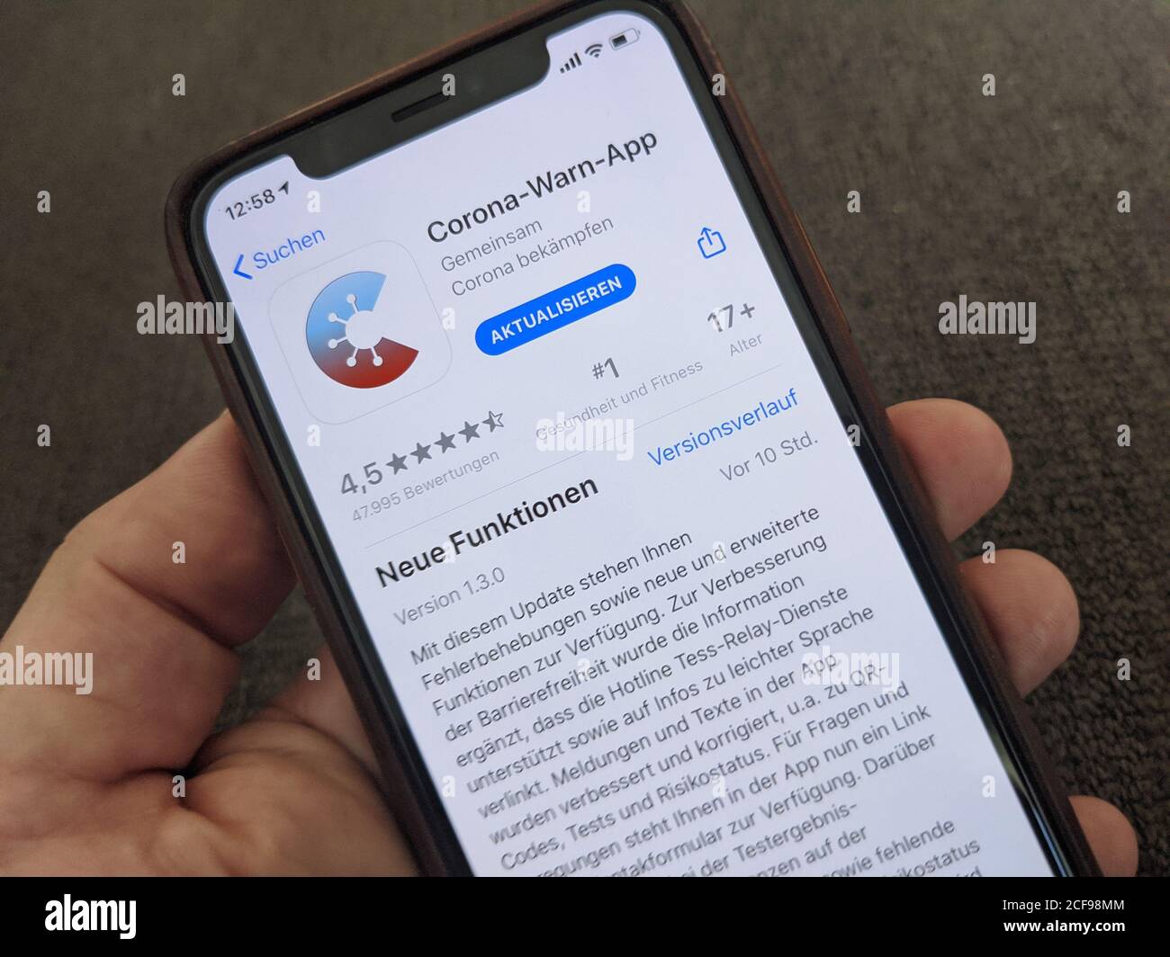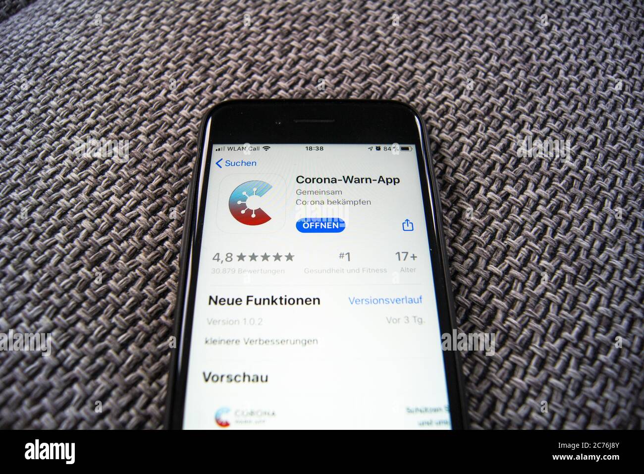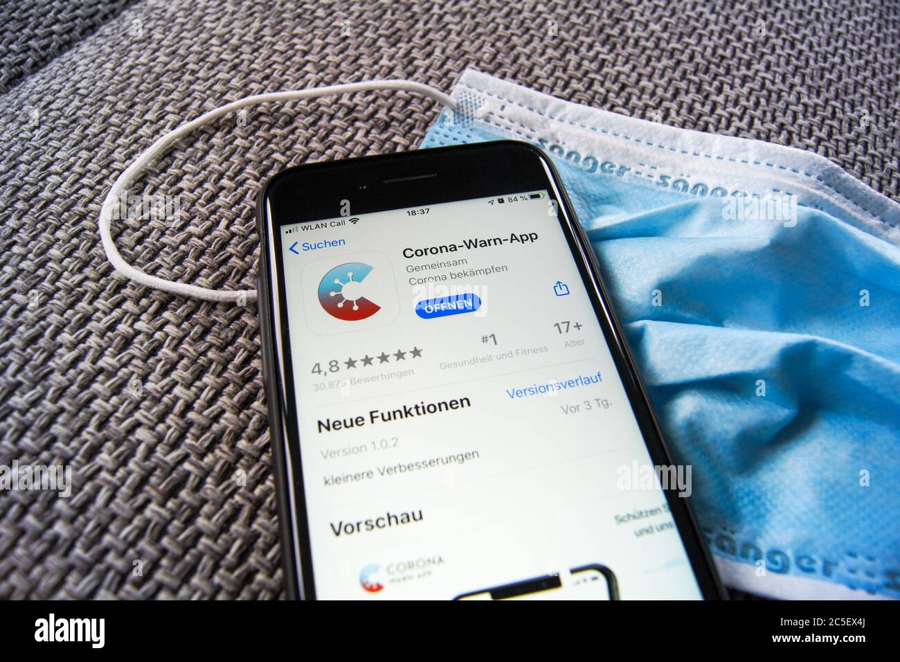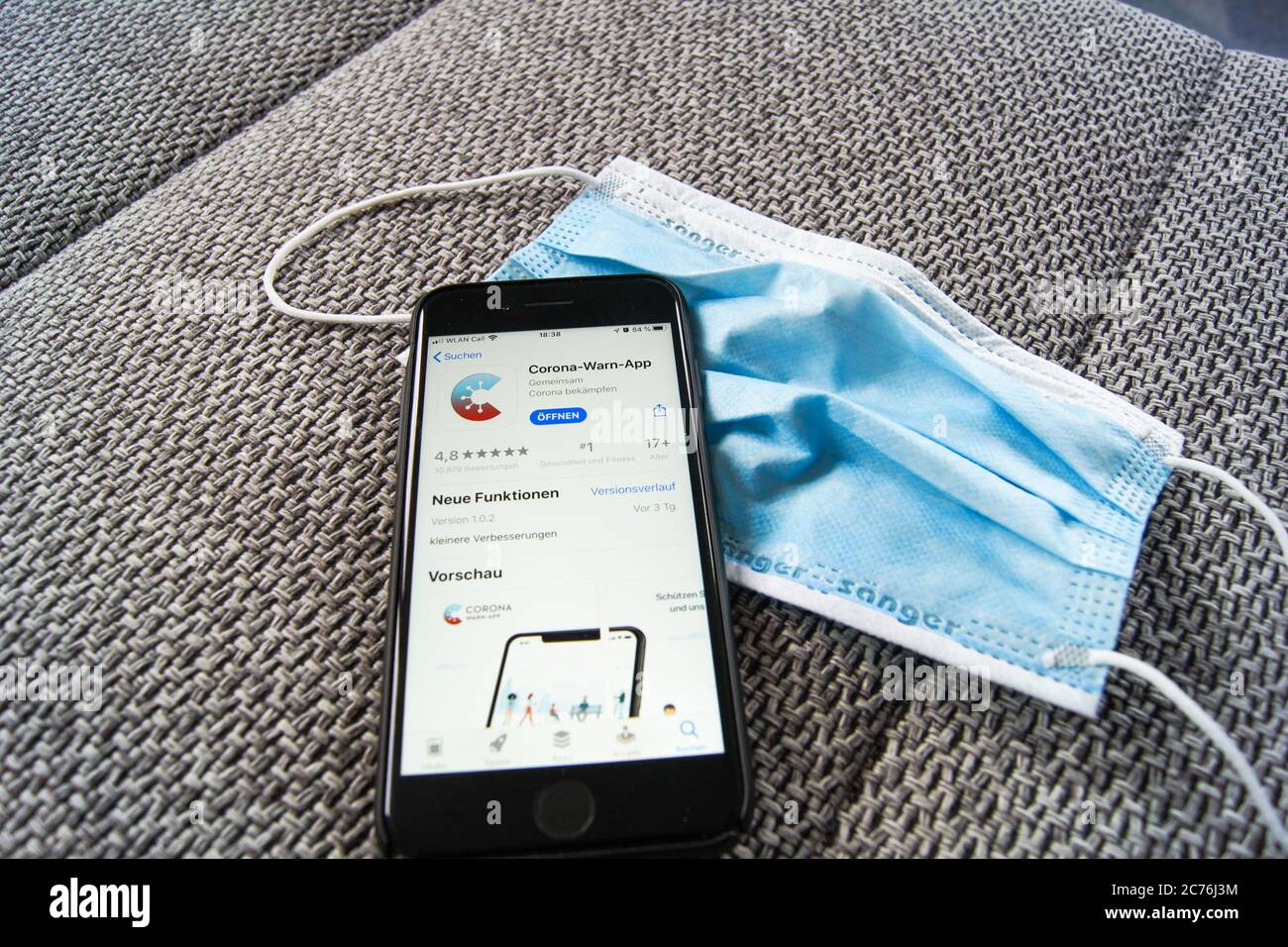 Corona Warn App Of The German Federal Government In The Apple App Store On A Smartphone Lieing On A Protective Mask Stock Photo Alamy