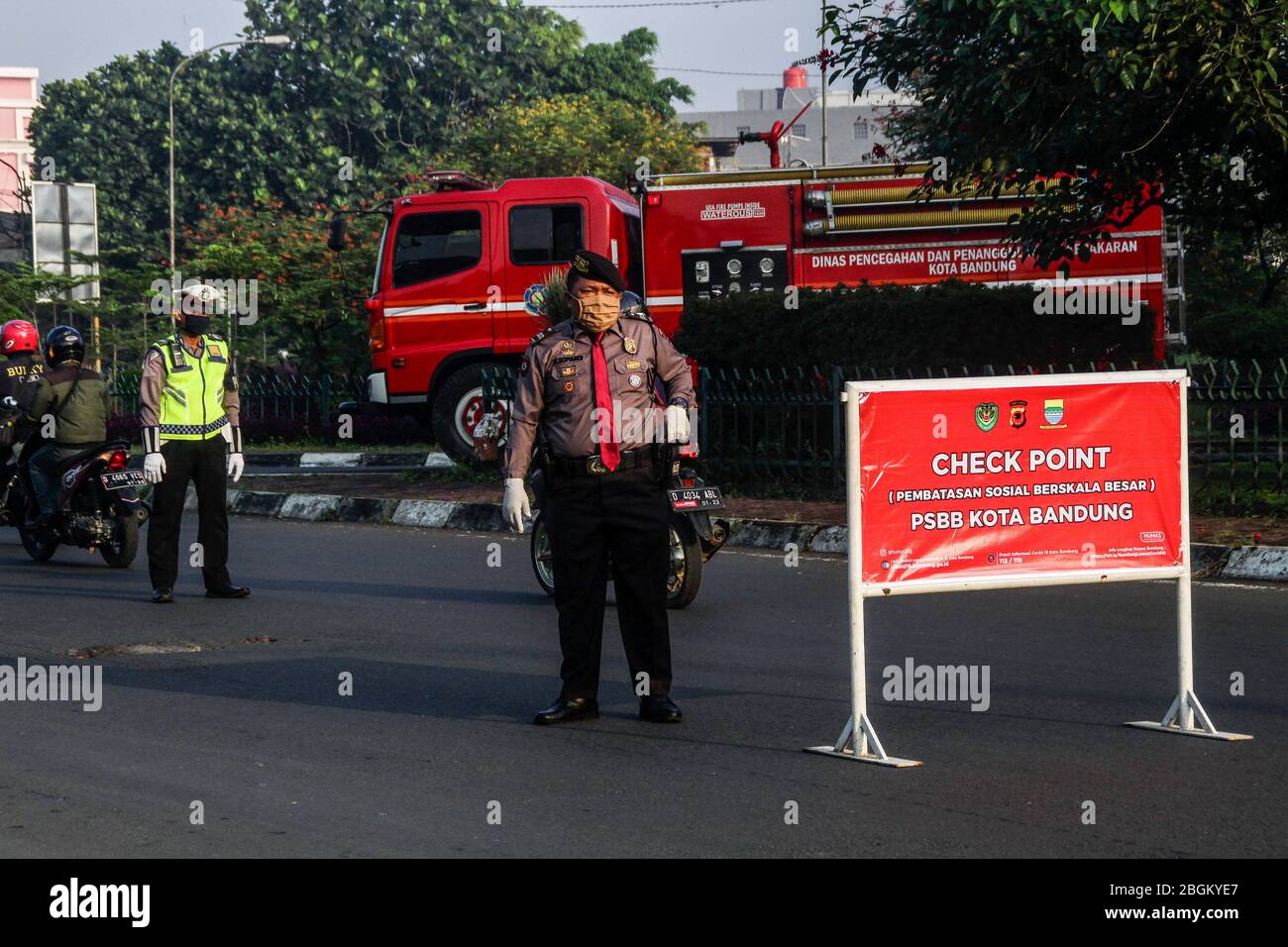 Bandung Indonesia 22nd Apr 2020 Indonesian Police Officers Control Traffic During The Implementation Of The Large Scale Social Restrictions At A Checkpoint In Cibiru Bandung Large Scale Social Restrictions Psbb In The City Of