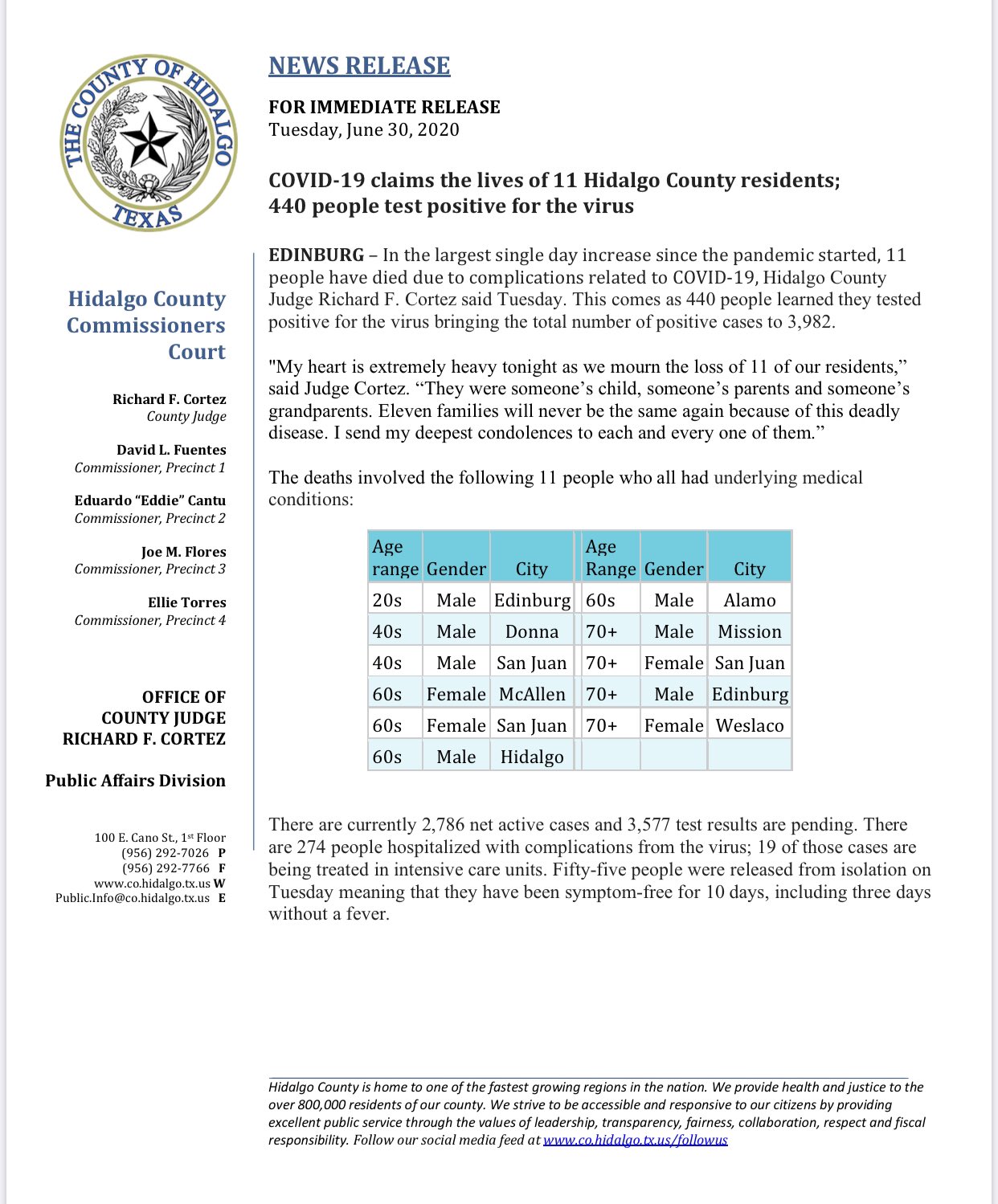 Hidalgo County On Twitter 11 People Have Died Due To Complications Related To Covid 19 And 440 Tested Positive Today My Heart Is Extremely Heavy Tonight As We Mourn The Loss Of 11