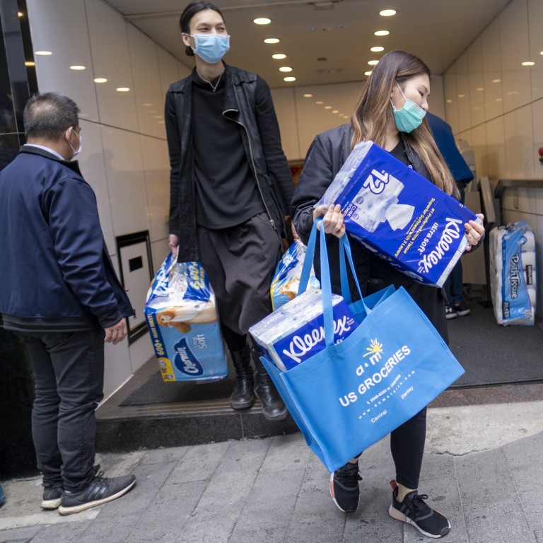 Consumer Buying Panic About Coronavirus Covid19 Concept People Buying Essentials In Bulk At Supermarkets Concept Woman Hold Shopping Bag With Rolls Of Toilet Paper Pasta And Buckweat Stock Photo Download Image