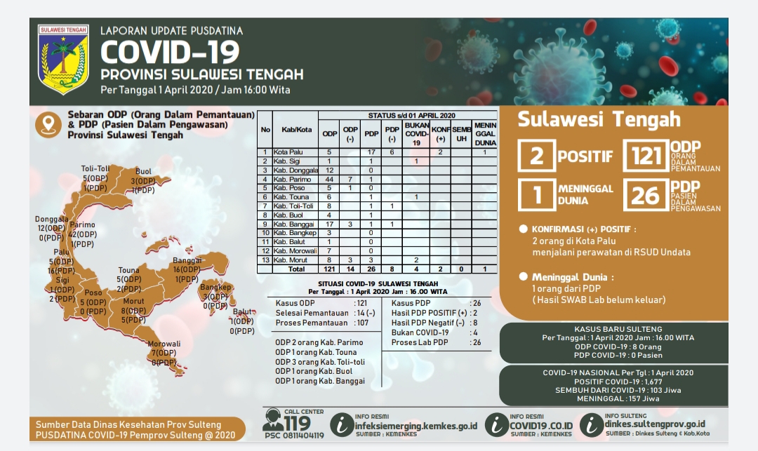 Informasi terkait covid 19 di sulawesi tengah. Haris kariming menyatakan terjadi penambahan empat kasus baru covid 19 di sulteng pada rabu 169. Hari ini terjadi penambahan kasus baru covid 19 di sulteng yaitu dua orang di kota palu terkonfirmasi positif covid 19 setelah memeriksa hasil tes usap swab keduanya katanya di palu senin malam.