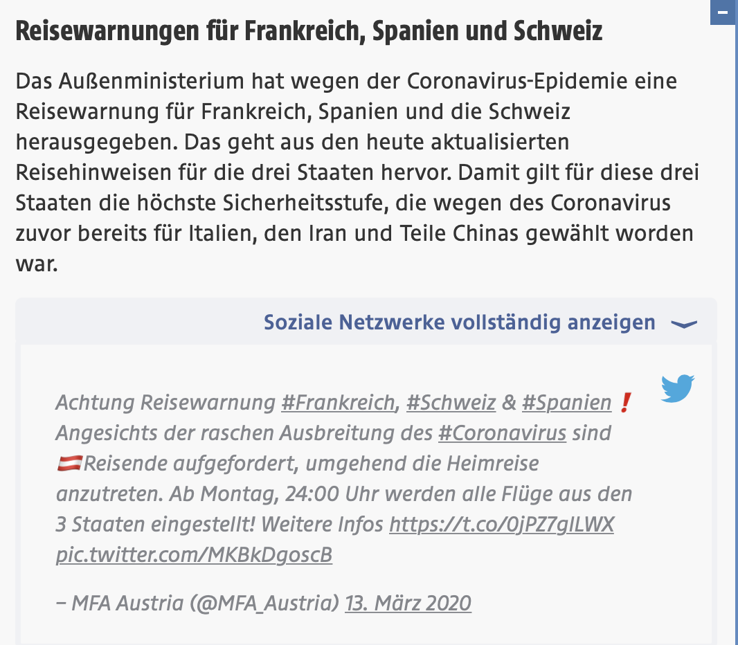 Osterreichisches Aussenministerium Achtung Reisewarnung Frankreich Schweiz Spanien Angesichts Der Raschen Ausbreitung Des Coronavirus Sind Reisende Aufgefordert Umgehend Die Heimreise Anzutreten Ab Montag 16 03 24 00 Uhr Werden
