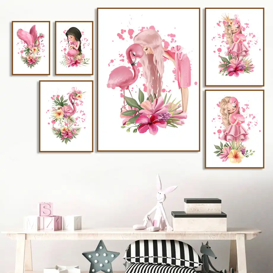 Cuadro Sobre Lienzo Para Pared Carteles Nordicos E Impresiones Para Pared De Bebes Y Ninos Decoracion Del Hogar Flamenco Nina Flor Rosa Aliexpress
