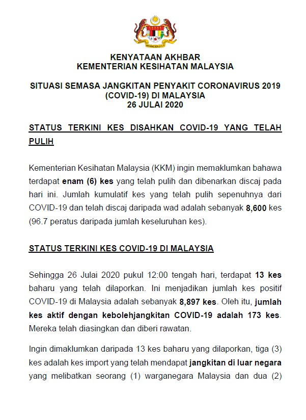Kkmalaysia On Twitter Kenyataan Akhbar Kkm Situasi Semasa Jangkitan Penyakit Covid 19 Di Malaysia 26 Julai 2020 6 Kes Sembuh 13 Kes Baharu 10 Tempatan 3 Import 1 Kes Kematian