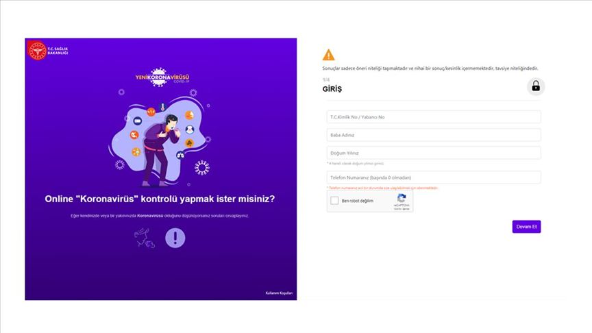 Koronaonlemsaglikgovtr adresinden kolaylikla corona virues ihtimaline karsi test yapilabiliyor. Buraya tiklayarak koronaonlemsaglikgovtr adresine girerek form alanini doldurduktan sonra size yoeneltilen sorulari yanitlayarak online koronavirues kontrolue yapabilirsiniz. Saglik bakanligindan korona virues oenlemleri kapsaminda bir adim daha geldi.