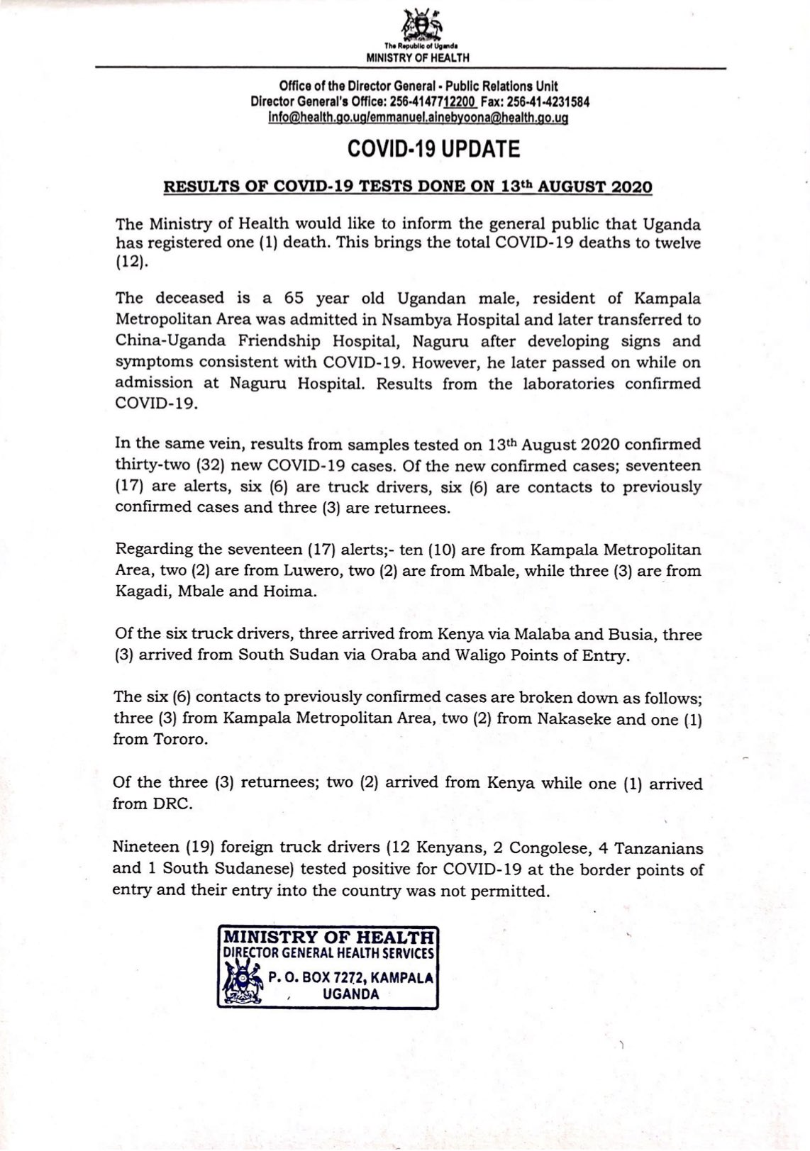 Ministry Of Health Uganda On Twitter Results From Covid 19 Tests Done On 13 August 2020 Confirm 32 New Cases The Cumulative Confirmed Cases Of Ugandans Is Now 1 385 One New Covid 19 Death